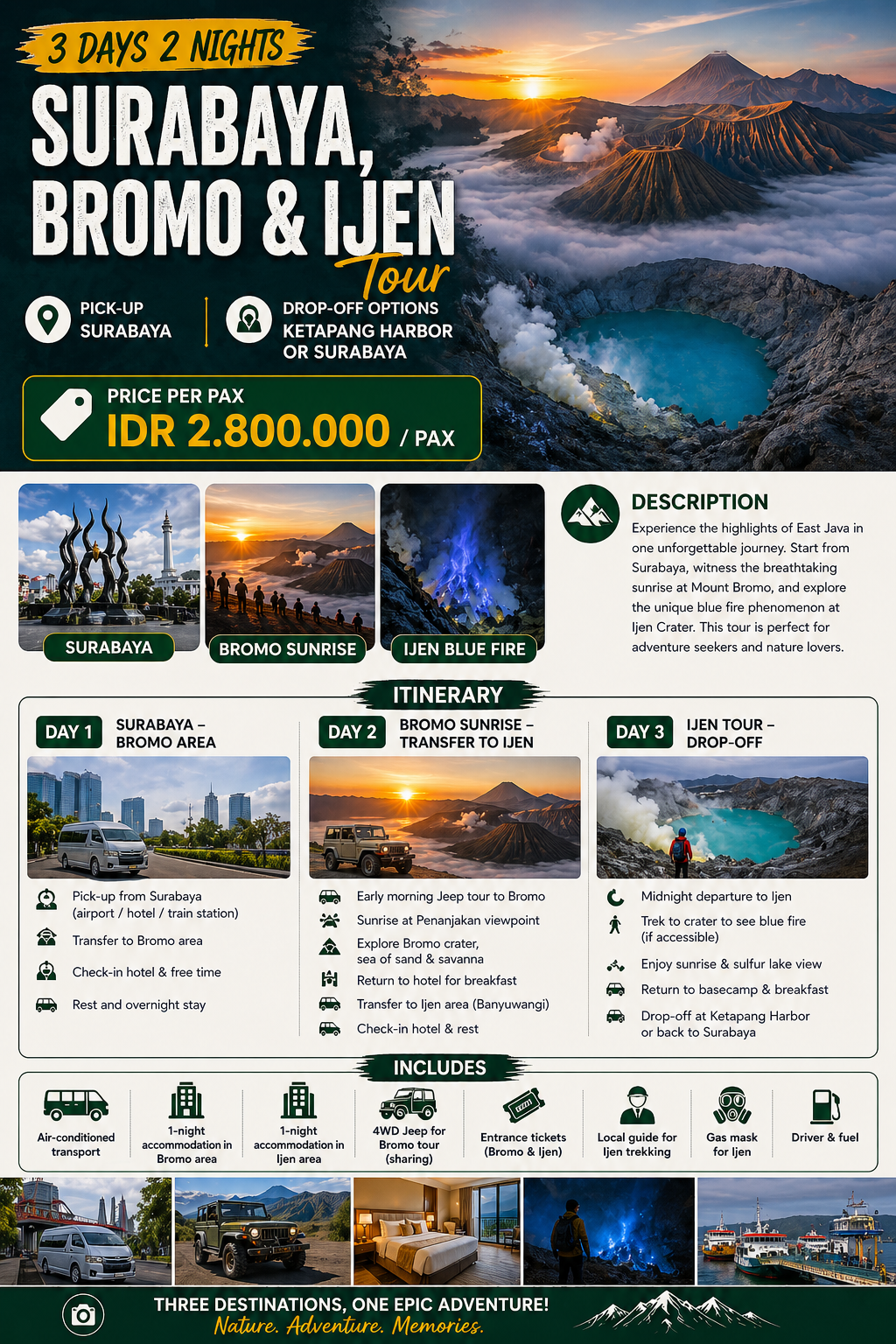 Experience the highlights of East Java in one unforgettable journey. Start from Surabaya, witness the breathtaking sunrise at Mount Bromo, and explore the unique blue fire phenomenon at Ijen Crater. This tour is perfect for adventure seekers and nature lovers.